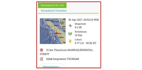 PANYABUNGAN (Mandailing Online) – Gempa berkekuatan sekitar 5.1 skala richter mengguncang Panyabungan, Mandailing Natal, Sumut, Minggu dini hari (30/4/2017) sekira pukul 00:52 WIB.