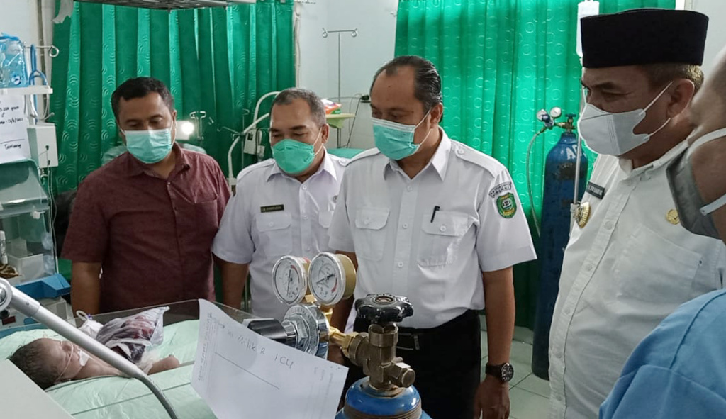 Bupati Madina, Jakfar Sukhairi Nasution (pakai peci) didampingi Direktur RSU Panyabungan, dr. Rusli Pulungan membesuk bayi tersebut di RSU Panyabungan, Rabu (1/9).