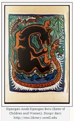 Lukisan kedua berjudul Sipangan Anak Sipangan Boru. Terus terang saya agak kecewa ketika mengetahui bahwa judul lukisan ini banyak diterjemahkan ke dalam Bahasa Inggris dengan “Eater of Children and Women”. Terutama karena salah satu kekuatan lukisan ini justru berada pada judulnya. Ada makna yang tidak masuk dalam proses penerjemahan itu, seperti yang akan kita lihat nanti.