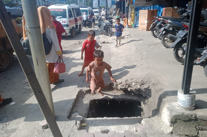 Terlihat anak anak asyik melihat lobang trotoar yang tidak diberi garis pembatas oleh PT Jasa Kontruksi selaku perusahaan pekerja proyek ( fikri )