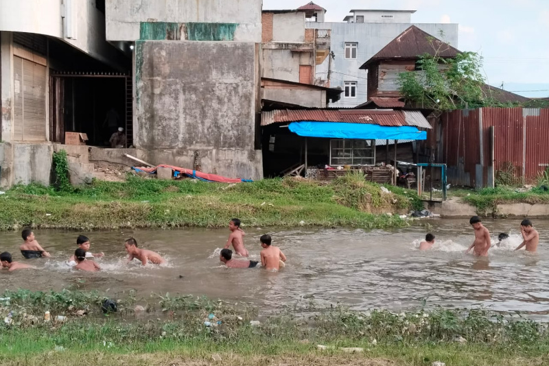 Sungai aek mata di pusat kota panyabungan saat dimanfaatkan anak anak untuk mandi ( fikri)