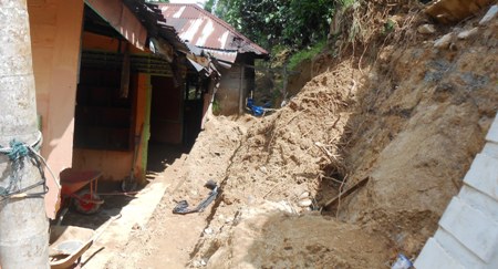 “Tanah di bagian belakang jatuh disertai lumpur bercampur air, akibatnya dinding bagian belakang rumah jebol. Lumpur dan air langsung masuk kedalam rumah mencapai 2 meter,” katanya.