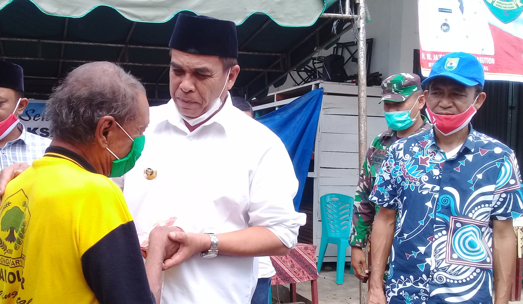 Bupati Madina, Jakfar Sukhairi Nasution saat menyerahkan BLT-DD kepada seorang penerima di Desa Sabajambu, Kecamatan Panyabungan, Selasa (17/8/2021). Foto: Mandailing Online/Dahlan Batubara