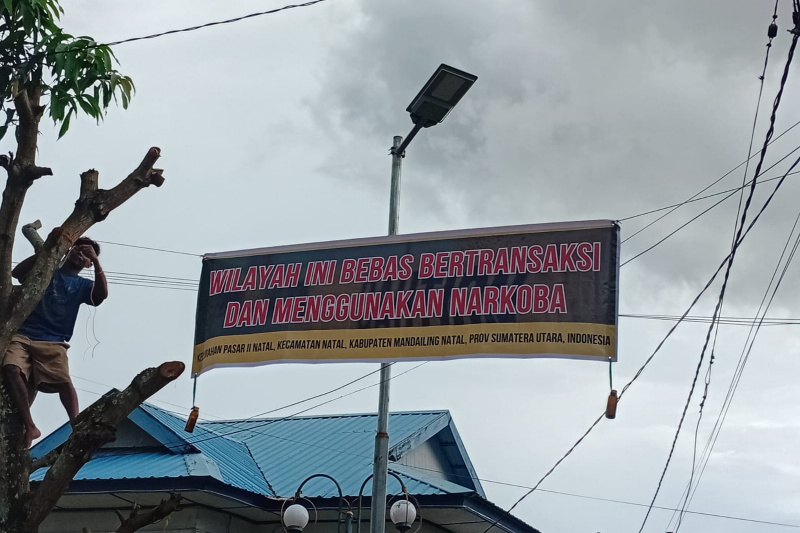 NATAL ( Mandailing Online ): Pasar II Natal, di Kecanatan Natal, Kabupaten Mandailing Natal dihebohkan dengan berdirinya sebuah spanduk bertulisan ” wilayah ini bebas bertransaksi dan menggunakan narkoba”. Spanduk itu dipasang di samping Kantor Lurah Pasar II Kecamatan Natal, Kabupaten Mandailing Natal, Sumatera Utara. Kabarnya spanduk ini di naikkan oleh kaum anak muda wilayah tersebut.