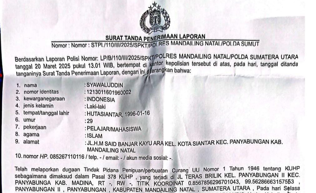 Sebelumnya diberitakan, jasa pengiriman uang Teras Brilink milik Syawaluddin di Jalan Bhakti Abri diduga ditipu oleh perempuan berinisial MSL, warga Panyabungan, hingga menimbulkan kerugian Rp 24,8 juta. Peristiwa ini terjadi pada Selasa 18 Maret 2025 pukul 21.00 WIB.