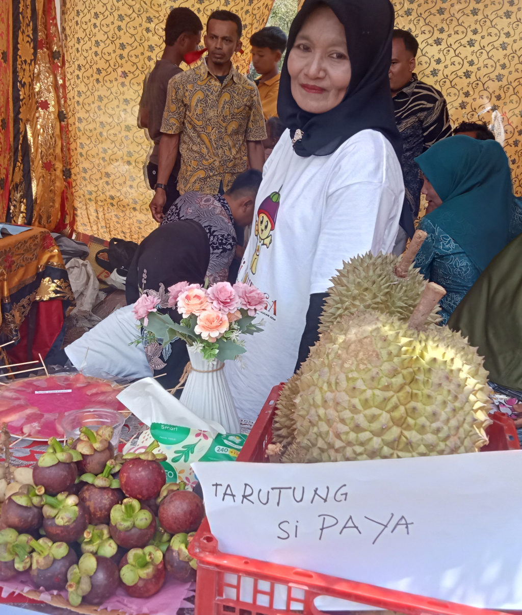 Selain itu, stan ini juga memajang pelbagai jenis buah: durian, manggis, lansat, rambutan. Yang menonjol adalah durian berlabel “Tarutung si Paya”, jika di-bahasa Indonesia-kan bernama durian paya. Sekilas pandang, tekstur durian ini mengarah pada pola duri durian bawor dengan postur ruang lebar mengisaratkan daging buah tebal.