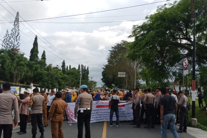 Didepan Bupati para pengunjuk rasa tetap momohon agar Bupati membatalkan menghapuskan hasil SKTT yang dinilai sarat kecurangan. Karena banyak peserta yang lama mengabdi sebagai tenaga honor namun nilai SKTT nya rendah, sementara mereka yang lulus banyak yang hanya baru jadi tenaga honor nilainya tinggi.