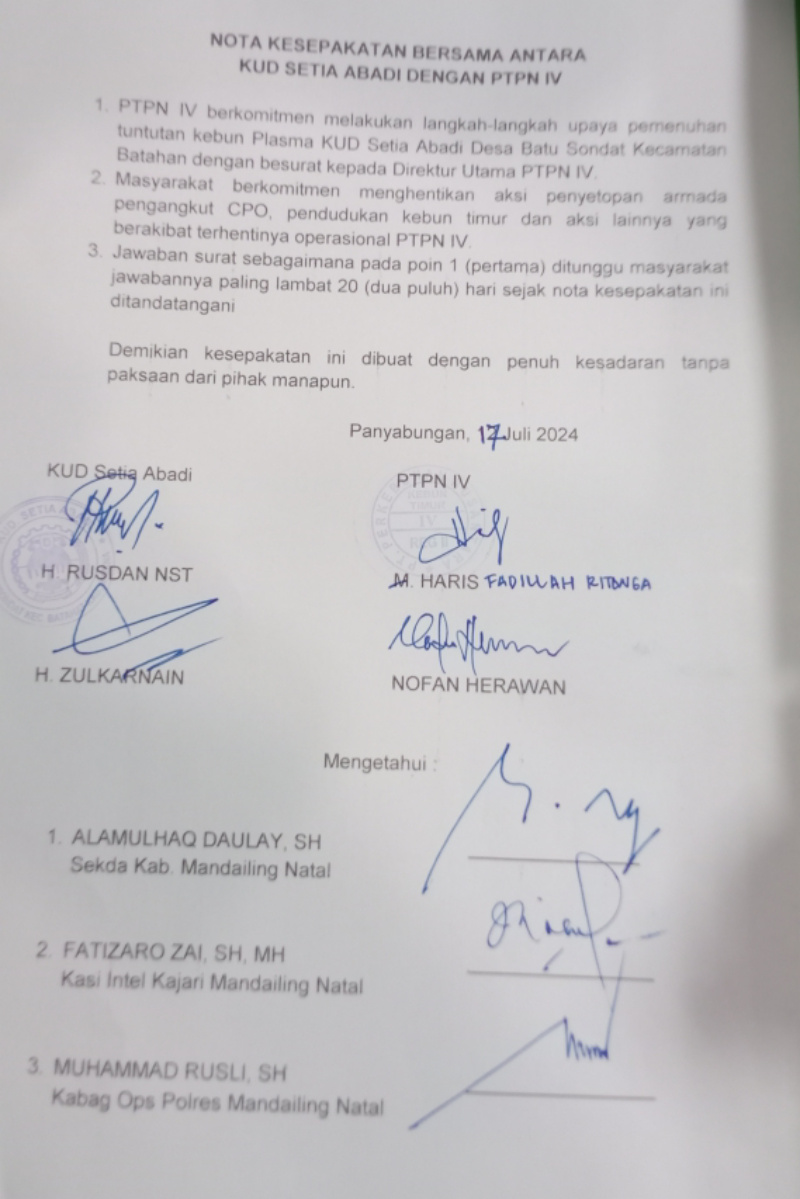 1. PTPN IV berkomitmen melakukan langkah-langkah upaya pemenuhan tuntutan kebun plasma KUD Setia Abadi Desa Batu Sondat Kecamatan Batahan dengan bersurat kepada Direktur Utama PTPN IV.