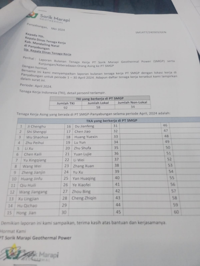 ” Jumlah Tenaga Kerja Asing (TKA) di Kabupaten Madina ada 28 orang dari Negara China. Mereka bekerja di pembangkit listrik panas bumi geotermal di PT. SMGP sebagai tenaga ahli atau bidang khusus, ” Kata Erman Gafar Kadis Naker Madina Rabu 19/6/2024.