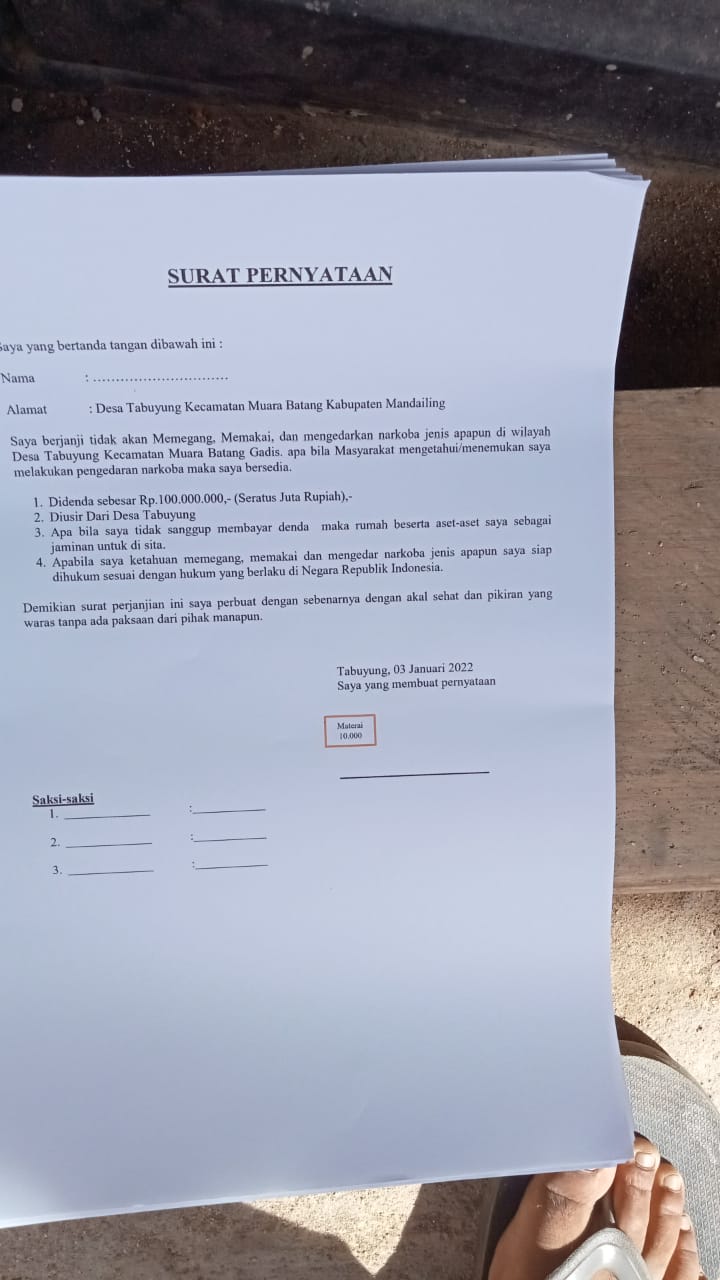 Hasil pertemuan itu disepakati bahwa masing-masing terduga bandar narkoba membuat perjanjian dengan beberapa komitmen, salah satunya bersedia diusir dari desa tersebut.