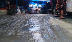 Gang pasar yang berliku-liku memperlihatkan sejumlah titik berkubang lumpur.